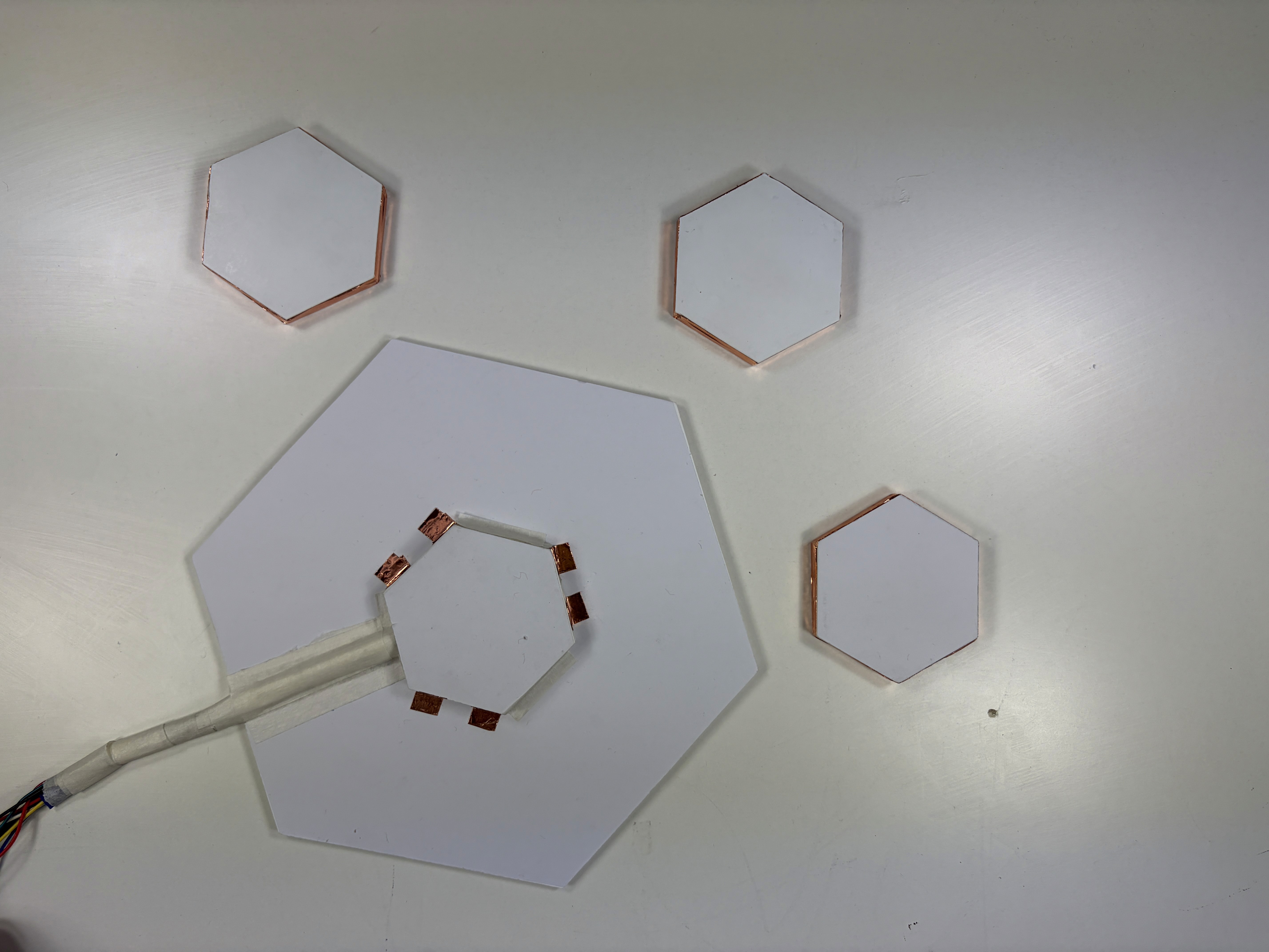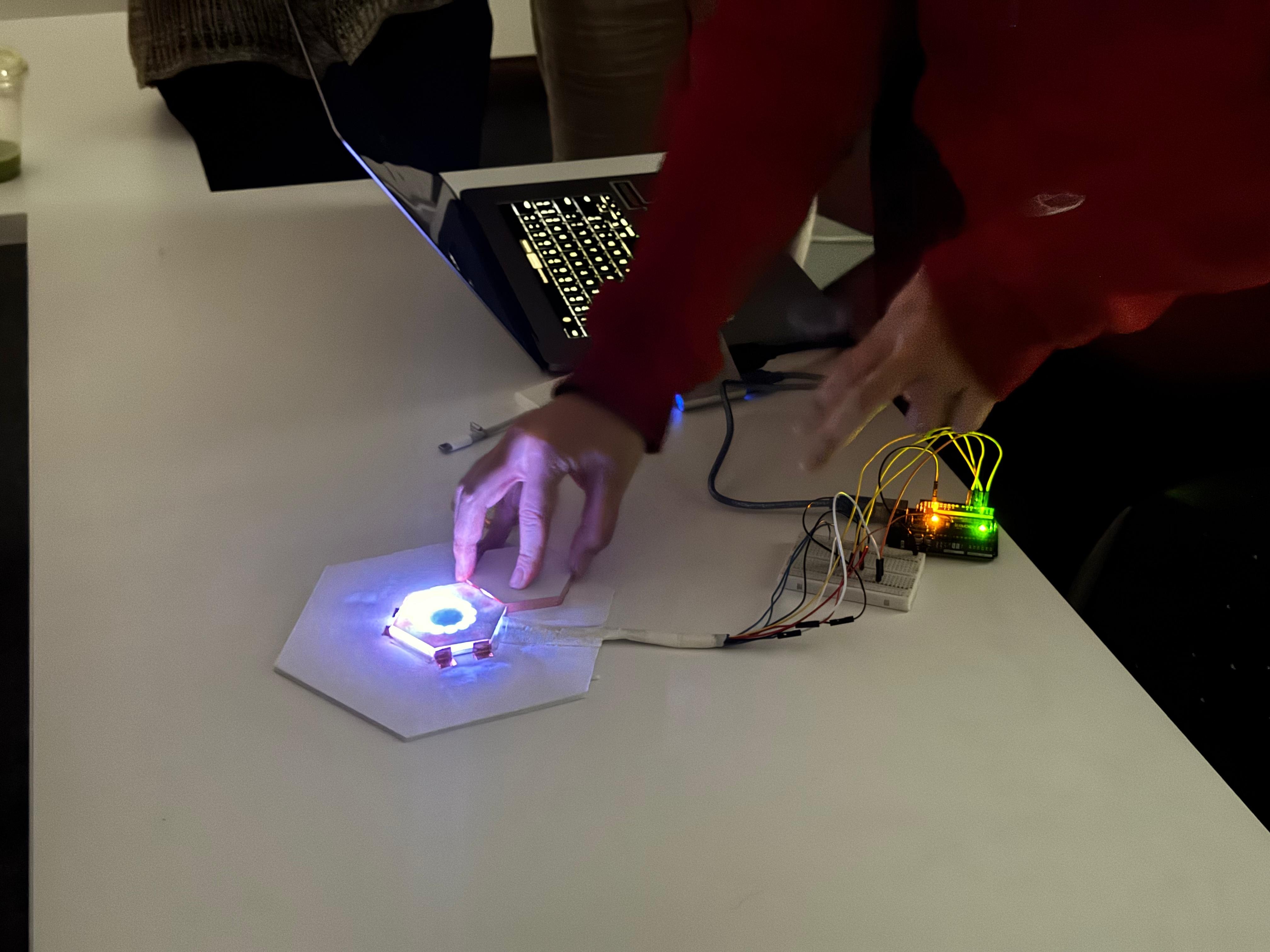 The physical system visualizes design as a joint. Hexagonal modules detect contact through copper wiring, and each new