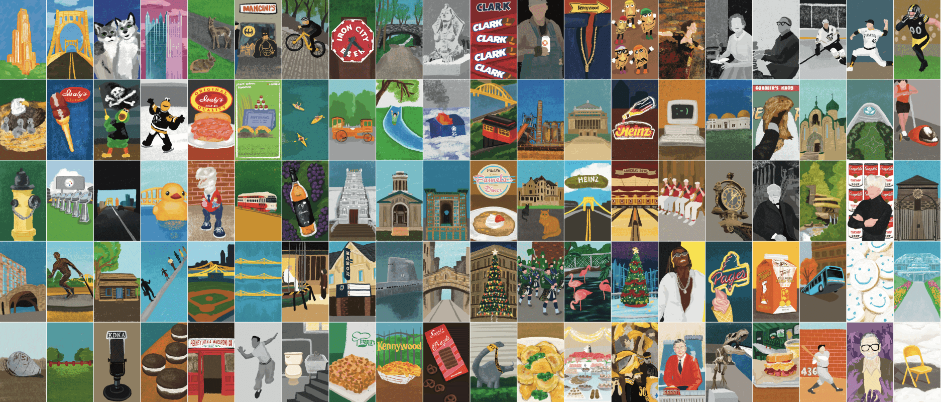I developed Pittsburgh Everyday, a 100-day illustration project executed. Over the course of the semester I produced one illustrated piece per day for 100 consecutive days, focusing on local Pittsburgh culture and everyday objects, from the quirky “Pittsburgh potty” to the Cathedral of Learning and pierogi.