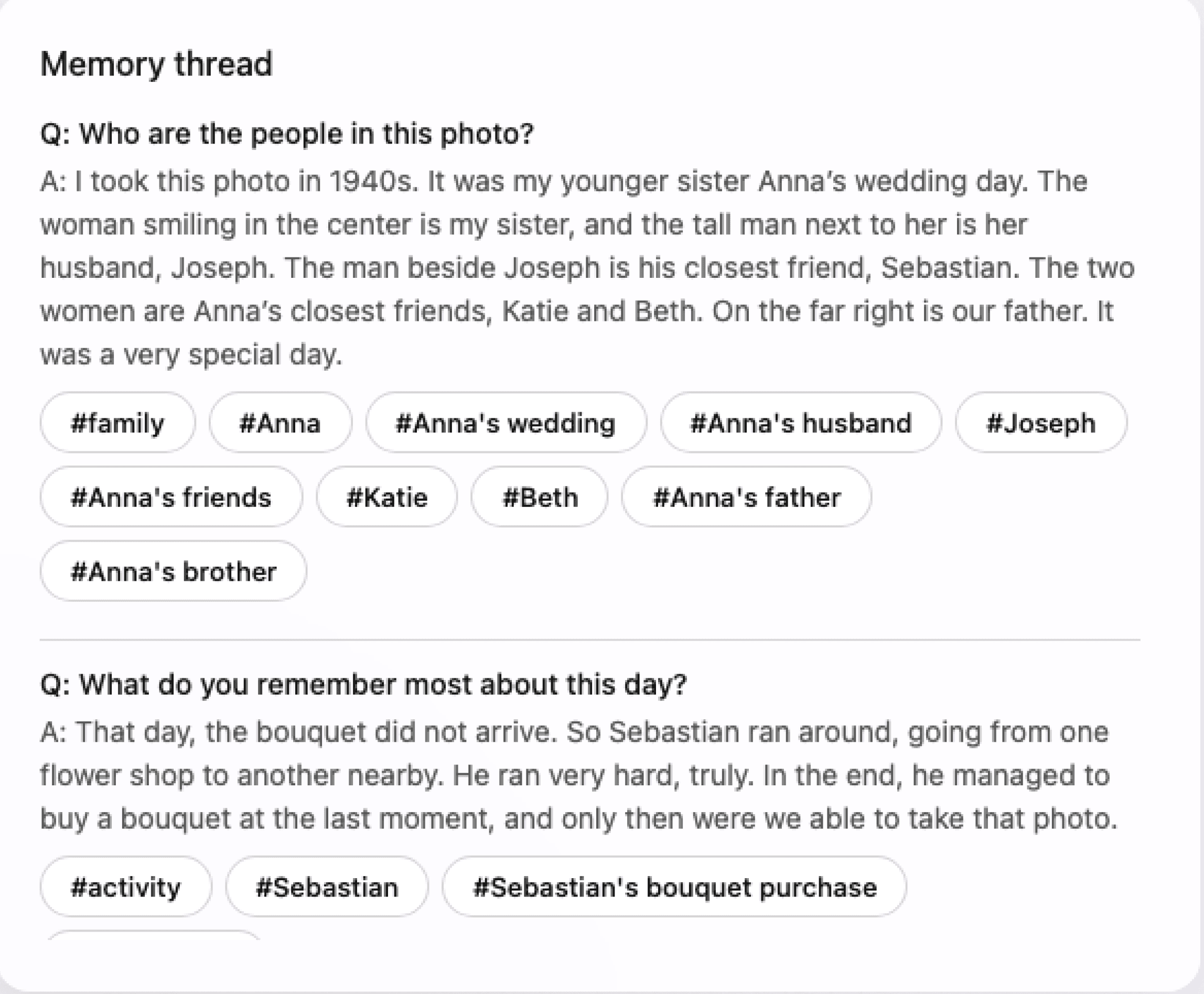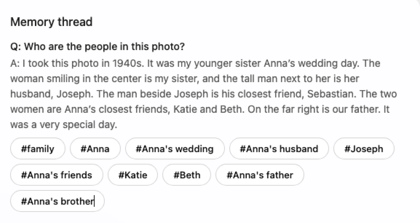 Each photo becomes a growing memory thread through accumulated questions and responses.