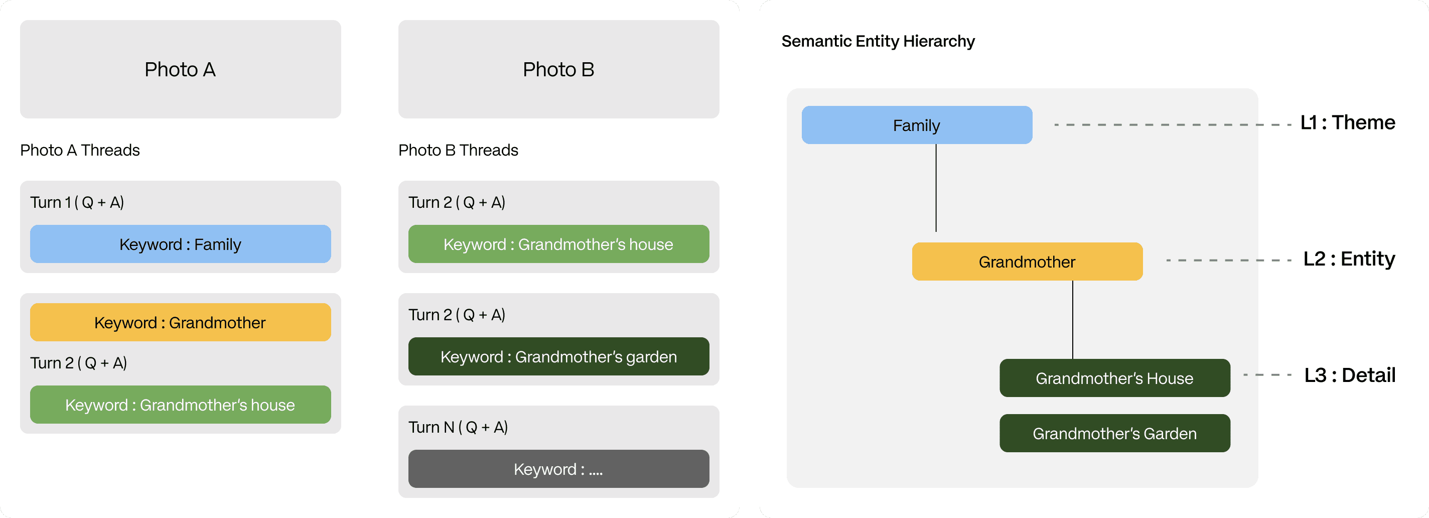 Memory Thread is an AI-assisted memory system that organizes personal memories through conversational recall rather than static storage. Each photo initiates a guided conversation, from which memory entities are extracted and linked across contexts.