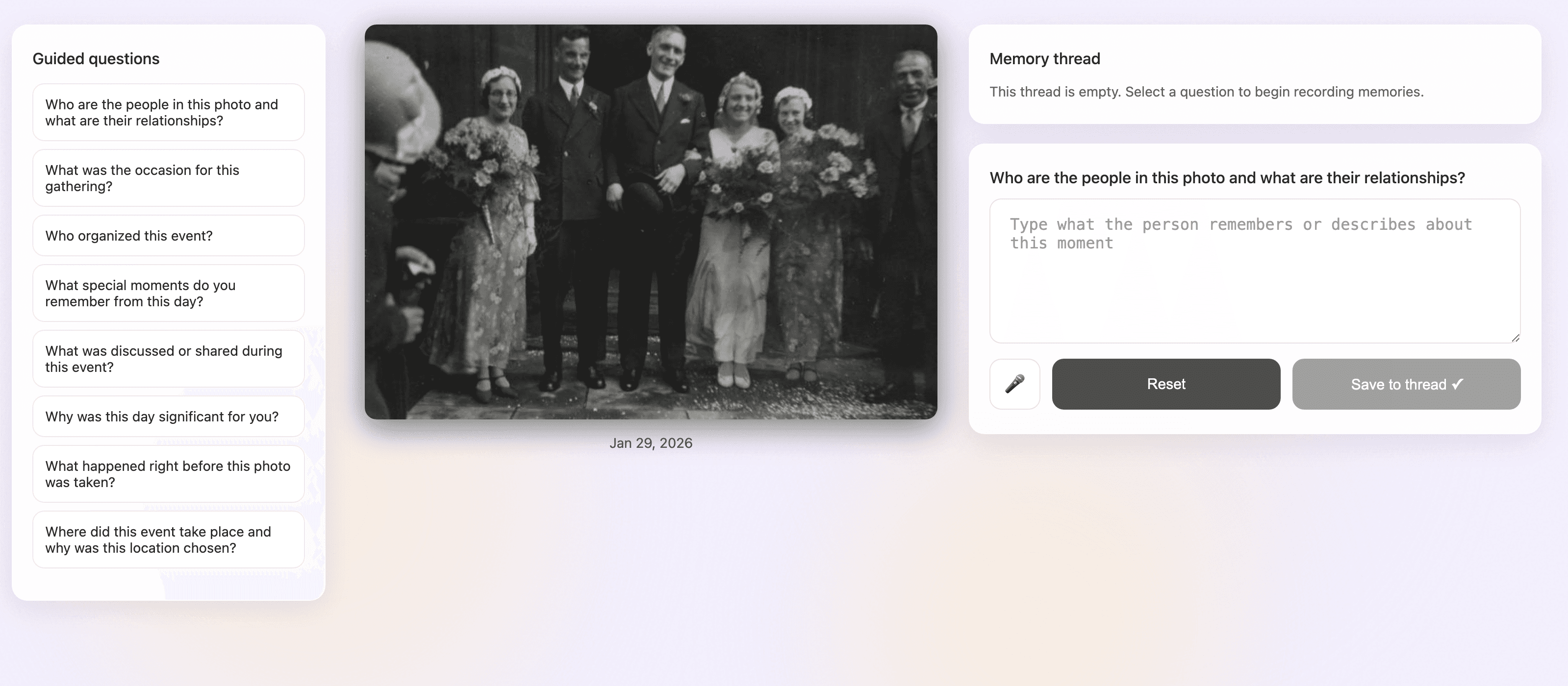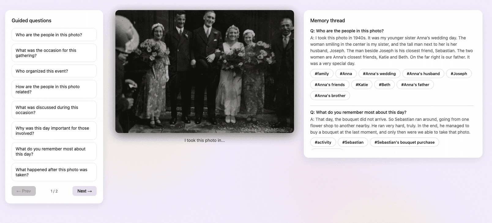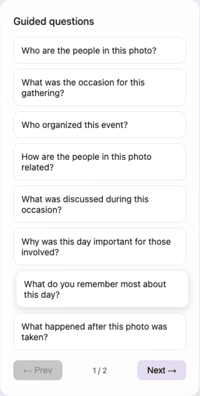 A photo initiates a guided conversation that helps users recall and articulate memories.