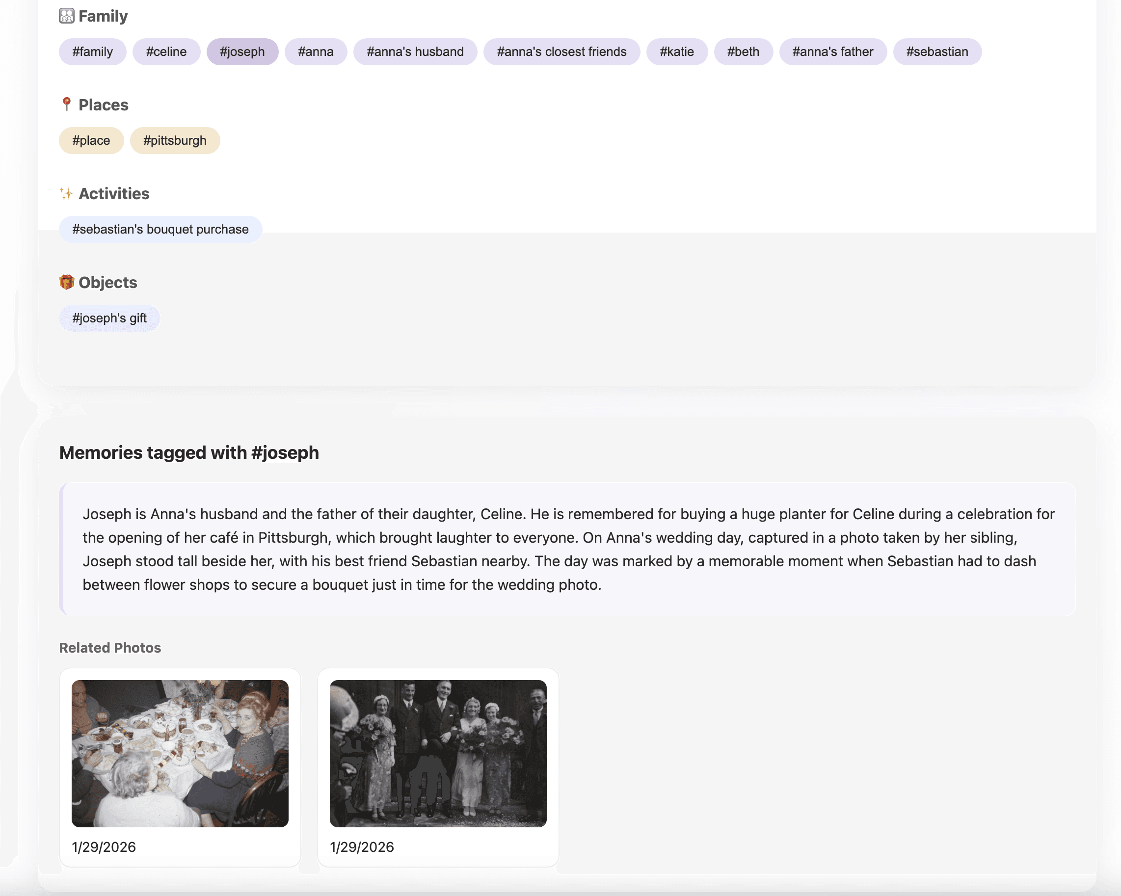 Memories commonly connected through people, places, and themes.
